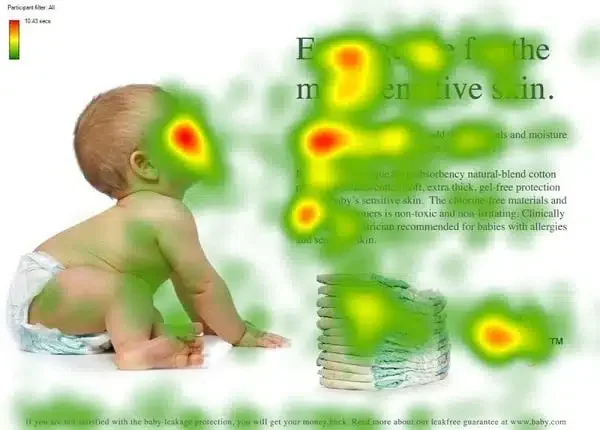De baby kijkt je aan; jij kijkt terug. De focus (rood) ligt op het gezicht van de baby. Daardoor krijgt de tekst rechts minder aandacht.